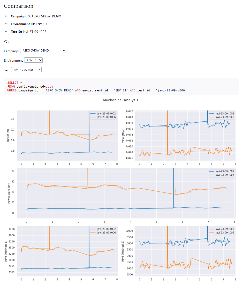 This allows us to produce a report which allows stakeholders to see that the new configuration from test t006 gives us the 11% performance boost in thrust we were looking for (compared to test t002), However, it's a brute-force approach. It's dramatically less efficient, consuming 45% more power to get there. This will result in a significantly shorter flight time for the drone.