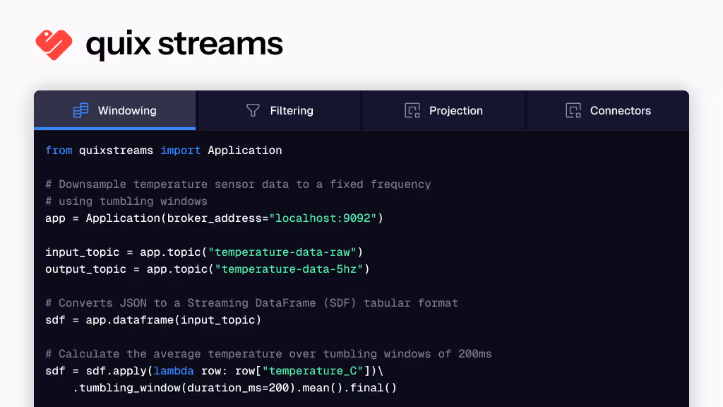 An open-source Python library for building real-time data pipelines on Kafka using a Pandas-like DataFrame API. Provides built-in operators for industrial data challenges: tumbling windows for time-aligning heterogeneous streams, graceful periods for late-arriving configuration data, stateful aggregations with automatic checkpointing, and backpressure-aware sinks that batch database writes to prevent overload.