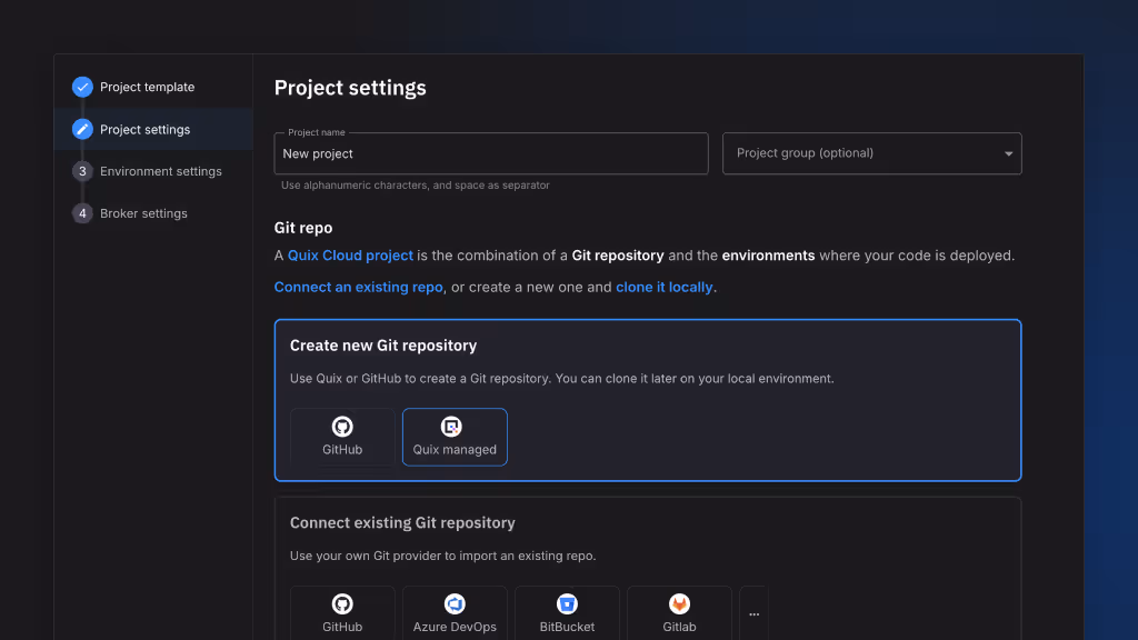 Git Integration makes every Quix project a Git repository with seamless integration to GitHub, GitLab, Bitbucket, or any Git provider. Projects track all changes—applications, topic definitions, environment variables—in version control. Use standard Git workflows: branch for new features, create pull requests for review, merge to deploy. This enables continuous integration and delivery with your existing CI/CD tools and processes. Your data platform infrastructure becomes code, with all the benefits of version control, collaboration, and automation that come with Git-based development.