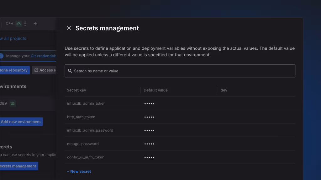 Secrets Management provides secure storage for sensitive information like API keys, database credentials, and authentication tokens. Secrets are encrypted at rest and accessed through environment variables at runtime, never hardcoded in application code or configuration files. Different secrets can be defined per environment—development uses test credentials while production uses prod credentials, both referencing the same variable names in code. This separation enhances security, simplifies credential rotation, and ensures applications work consistently across environments without exposing sensitive data.