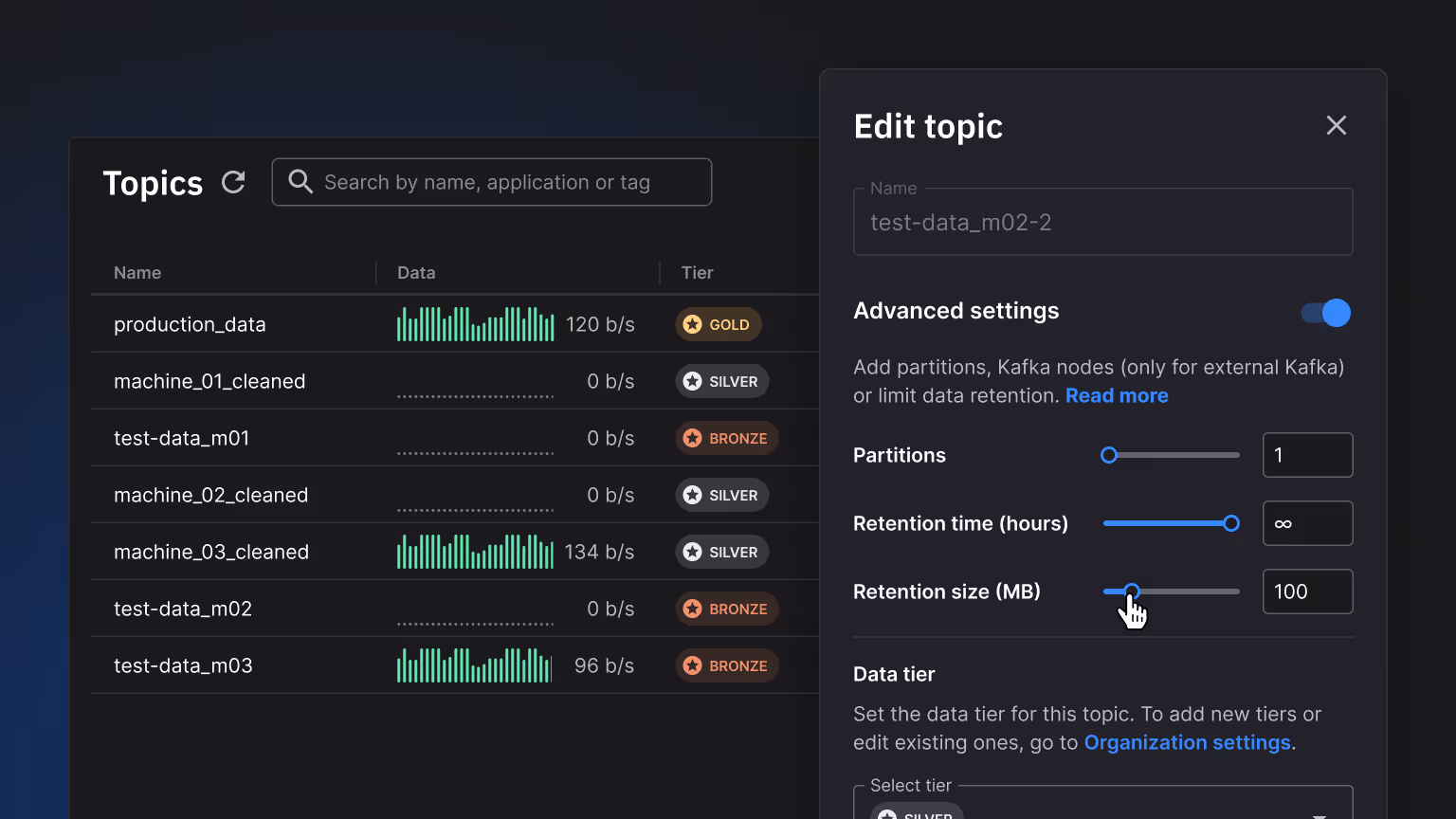Topics Management provides a self-service interface for Kafka topic configuration. Engineers create topics, adjust partition counts, set retention policies, and modify replication factors without submitting IT tickets or touching broker configuration directly. This puts topic management in the hands of teams building pipelines, while maintaining proper defaults and guardrails. Teams iterate quickly on topic configuration as their pipelines evolve, enabling a self-serve Kafka platform where data engineers control their own infrastructure.
