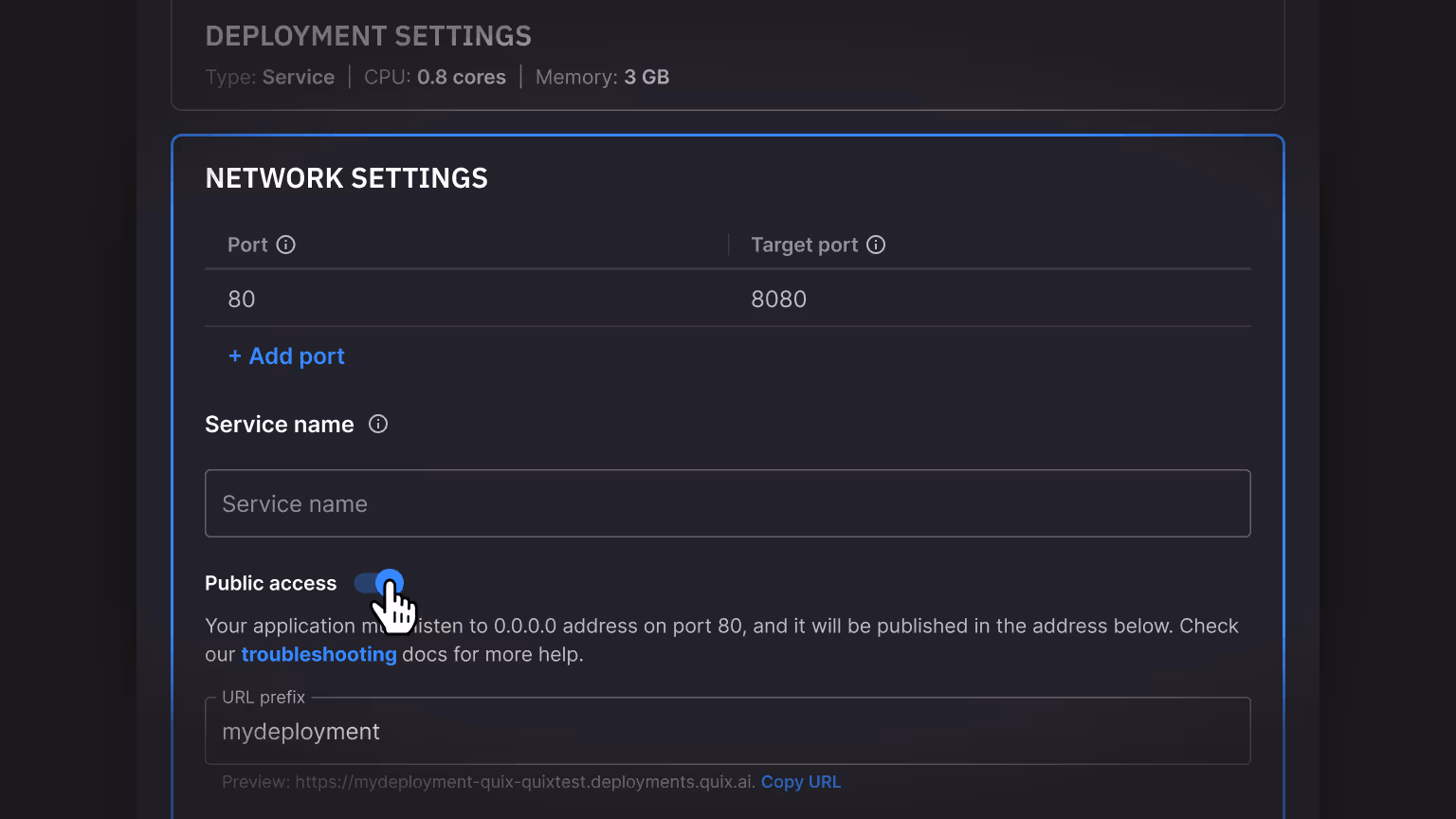 Network Configuration lets you control how deployments connect to each other and expose services externally. Define internal ports for service-to-service communication within your infrastructure, configure public URLs when applications need external access, and set up target ports for container networking. This simplifies what would otherwise require Kubernetes networking knowledge—you specify how applications should be reachable, and Quix handles the underlying ingress, service meshes, and routing. Engineers configure network connectivity through straightforward settings rather than YAML manifests or networking primitives.