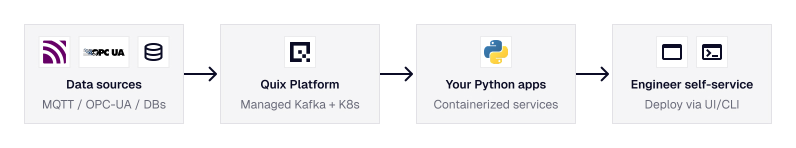 Quix gives you managed Kafka and Kubernetes so you can focus on building analysis tools instead of maintaining infrastructure. Your engineers deploy their own Dockerized Python applications while you keep full visibility and control.
